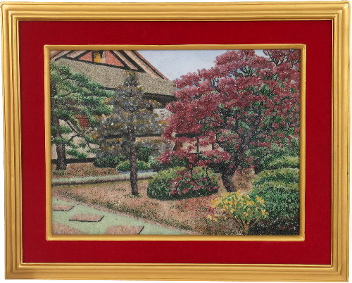 The scene depicts a simple house with a colorful trees. The painting is made by Burma tiny gem stone.