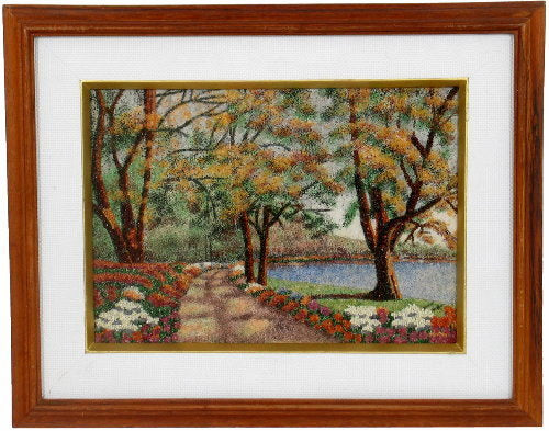 The scene depicts a Beautiful Central Park cover with trees and lake. The painting is made by Burma gem stone. The painting comes with hard wood frame.