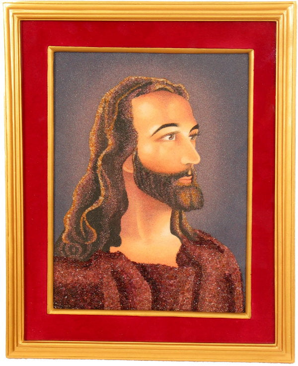 Unique, handmade gemstone portrait of Jesus Christ. Rare and traditional craftsmanship using time-honored techniques in which pieces of gemstone are used to "paint" the image. A wonderful conversation piece for any wall in your home or office.